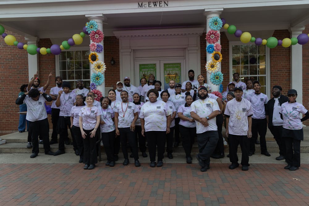 McEwen Dining Hall Staff pose for a photo in front of the McEwen Dining Hall for Mardi Gras on Feb. 17