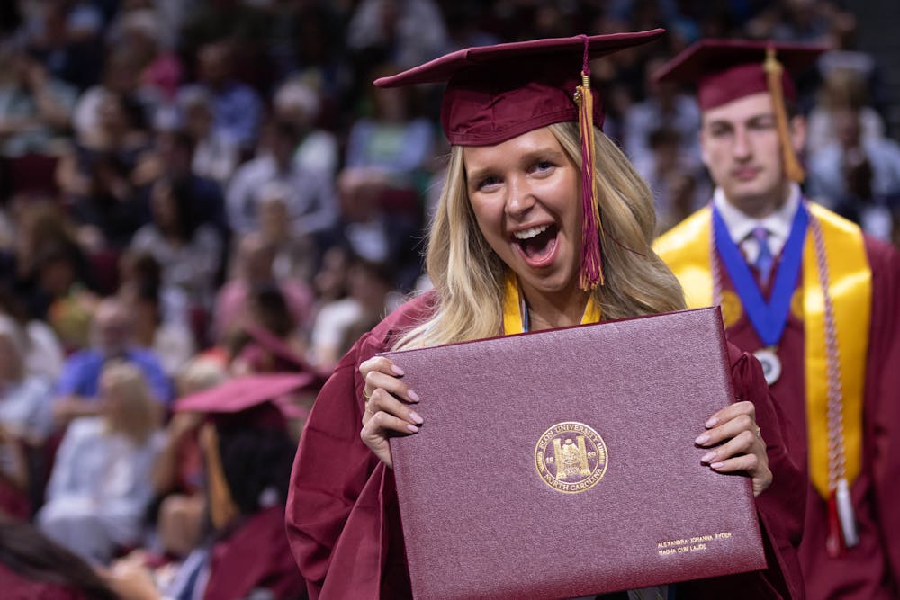 Graduating senior, Alexandra Ryder poses with degree at the Elon University 135th Undergraduate Commencement May 23 at Schar Center.