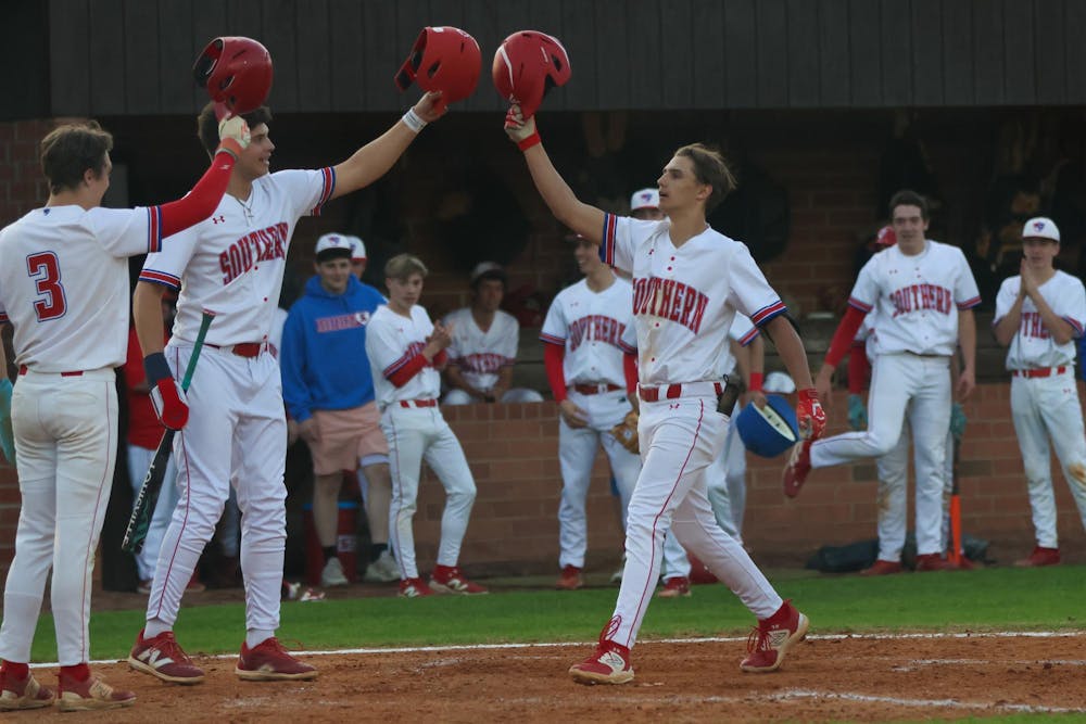 Freshman Camden Whittemore celebrates his three-run home run with his teammates against Person on April 1. The home run was the first in his high school career and helped Southern Alamance defeat Person 12-8.