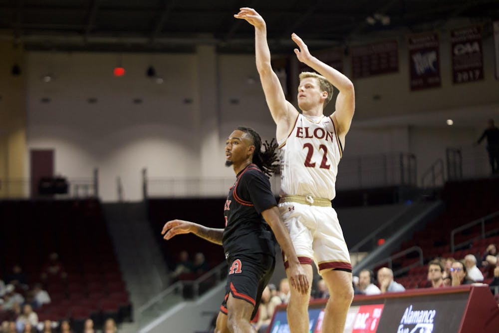 Redshirt Sophomore Ned Hull shoots a three-pointer during the Nov. 5 game against Belmont Abbey. This is the first home game of the season and Hull's first time back in the paint.