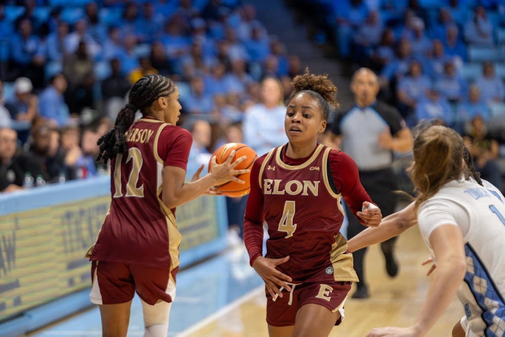 Junior Maraja Pass passes the ball to her team mate senior Laila Anderson in a game against UNC Chapel Hill on Nov. 6.