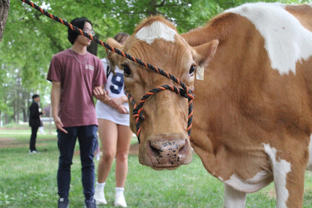 Pearl the cow and a calf were a main attraction at Earth Fest on April 24.