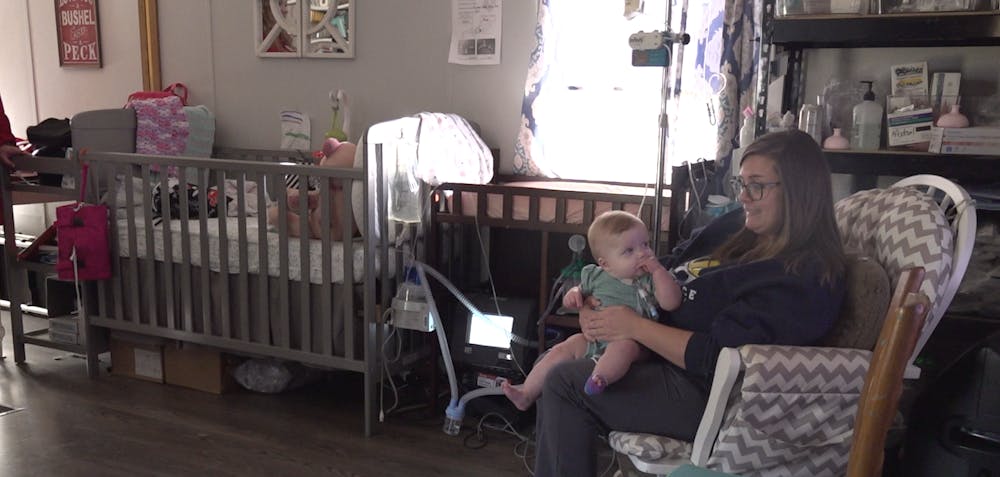 Paige Davis holds her daughter Harper as they wait for Senator Amy Galey to arrive at their home in Burlington, NC. Harper's crib and all her medicines are kept in the family's living room.