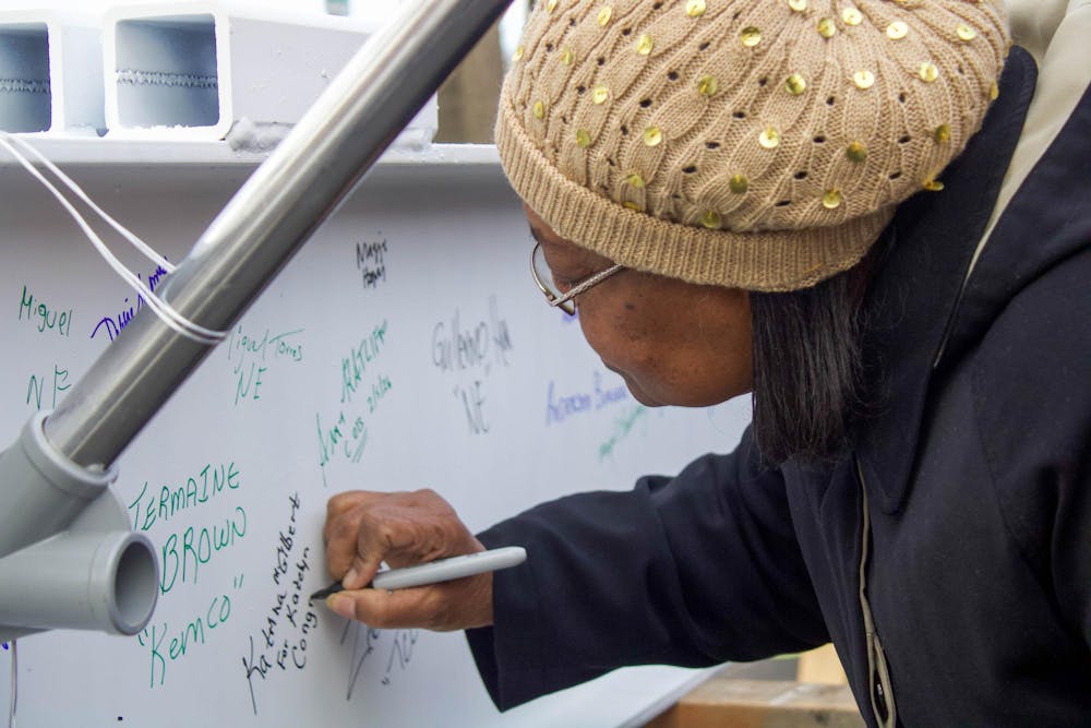 A community member signs her name at the Paramount Theater's Topping Out celebration on Feb. 5.