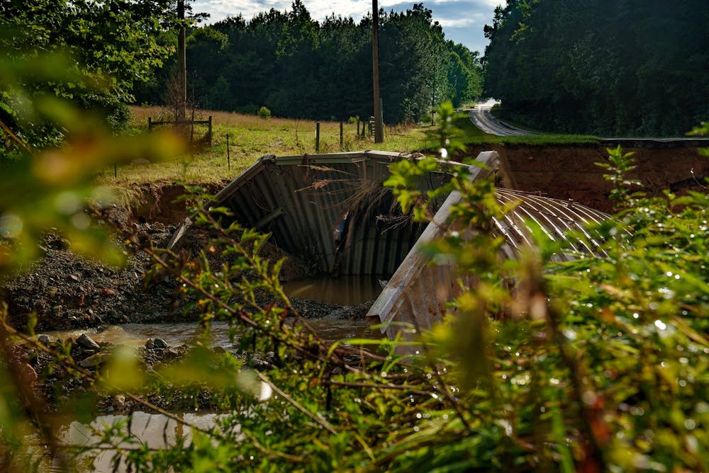 A large piece of Dickey Mill Rd collapses after flooding on July 10 in Mebane. A sedan crashed into the destroyed section, but the occupants likely escaped through a broken back window.