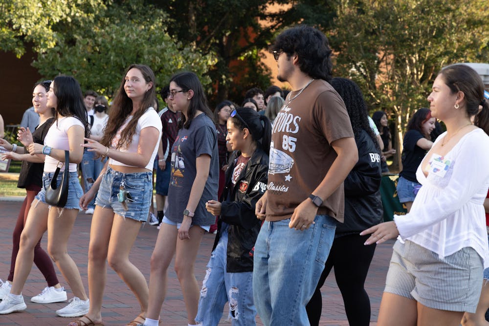 Attendees follow along with a salsa dance lesson during the Hispanic Heritage Month Kickoff on Sep 19 at Medallion Plaza.