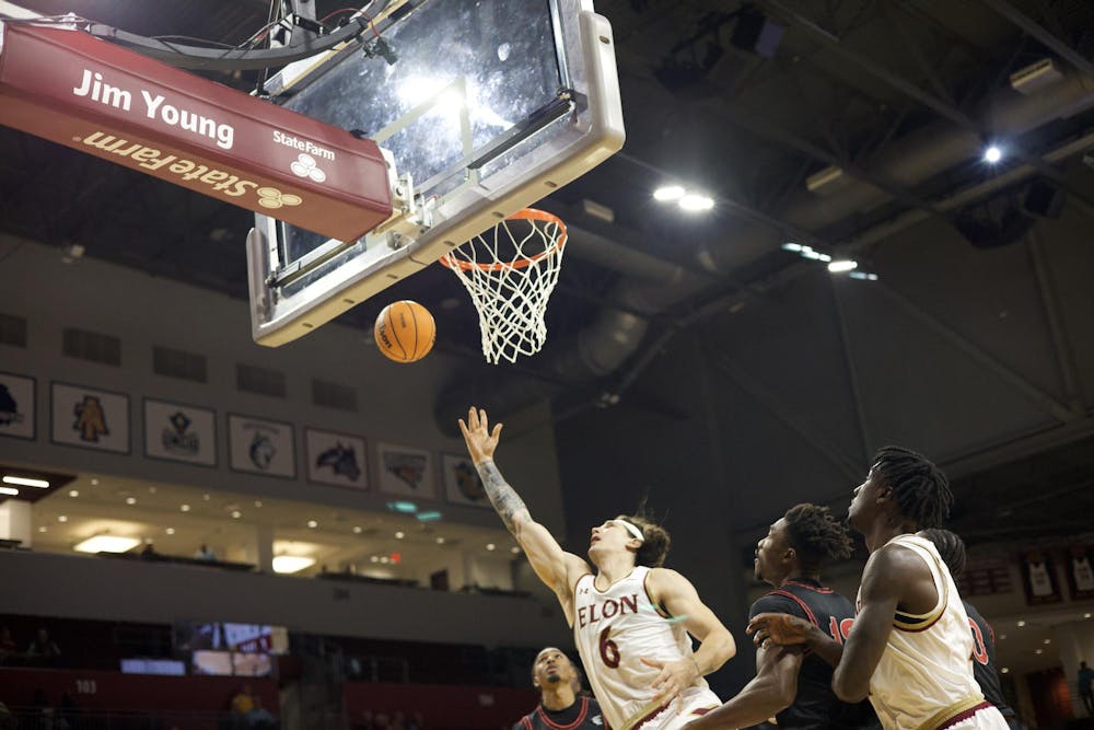 Graduate student Kacper Klaczek reaches to rebound the ball on Nov. 5 in a game against Bellmont Abbey.