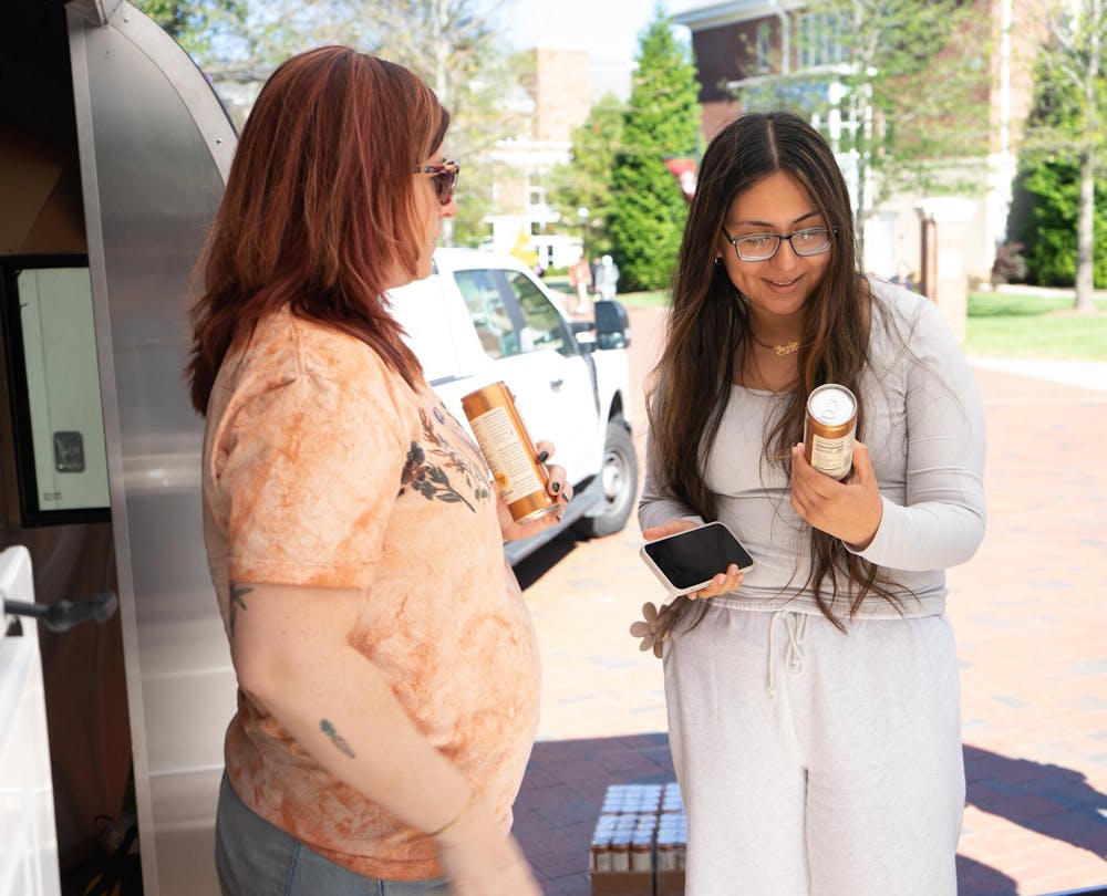 Tractor Mad Farmer Brand Manager Savannah Bollacker explains a drink to Freshman Jazline Rogel during the Farmer Tour on Oct. 22 at Medallion Plaza