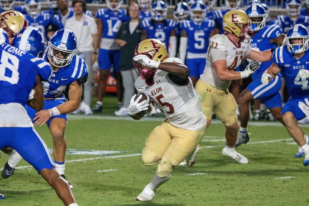 Sophomore TJ Thomas Jr. jukes past a Duke defender on Aug. 28.