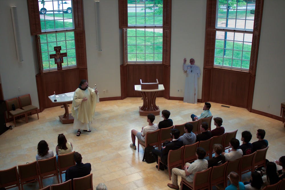 Father Peter Tremblay speaking at a memorial mass for Pope Francis on April 22 in the Numen Lumen Sacred Space.