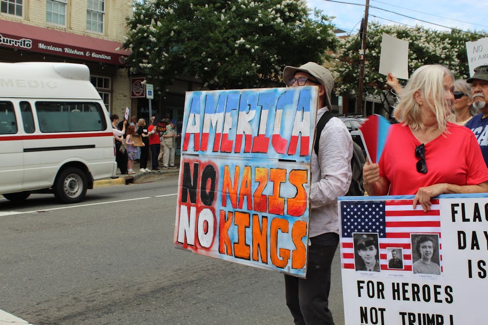 A demonstrator holds a sign stating "America. No Nazis. No Kings." on June 14 in Hillsborough for the No Kings protest.
