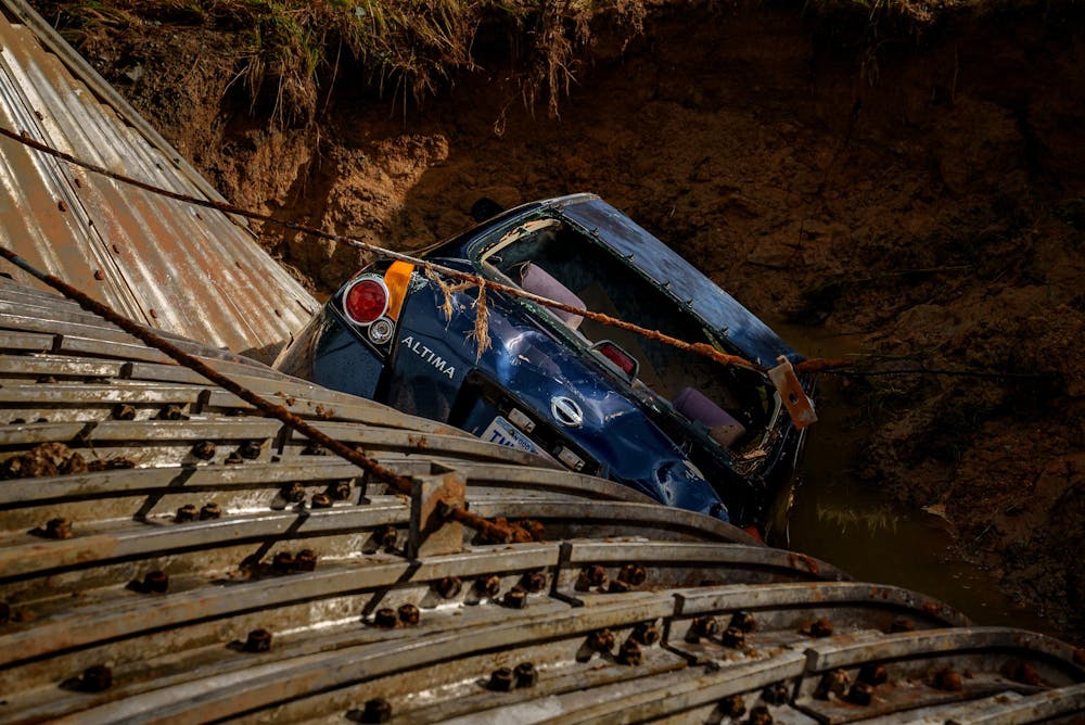 A large piece of Dickey Mill Rd collapses after flooding on July 10 in Mebane. A sedan crashed into the destroyed section, but the occupants likely escaped through a broken back window.