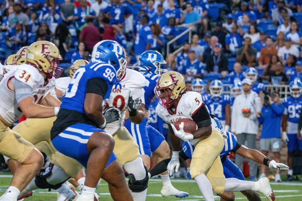 Sophomore running back TJ Thomas Jr. runs through a gap between defenders during Elon’s game against Duke on Aug. 28. The Phoenix lost 45-17.