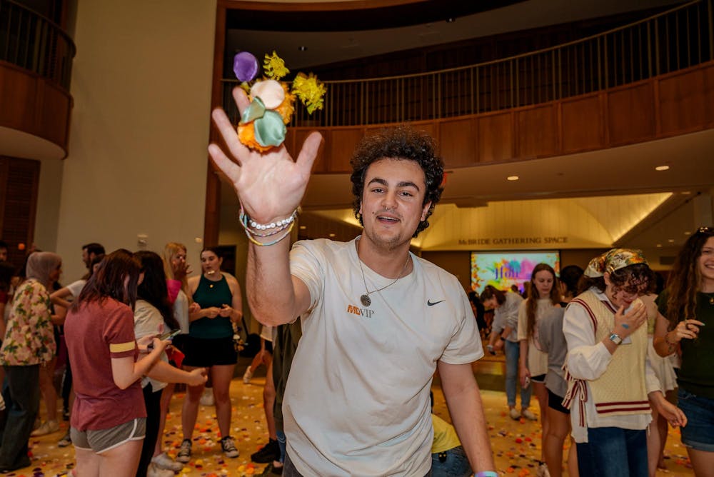 WSOE General Manager, junior Ahron Frankel, throws a handful of fake flowers and petals during the Holi celebration on April 25 in Numen Lumen.