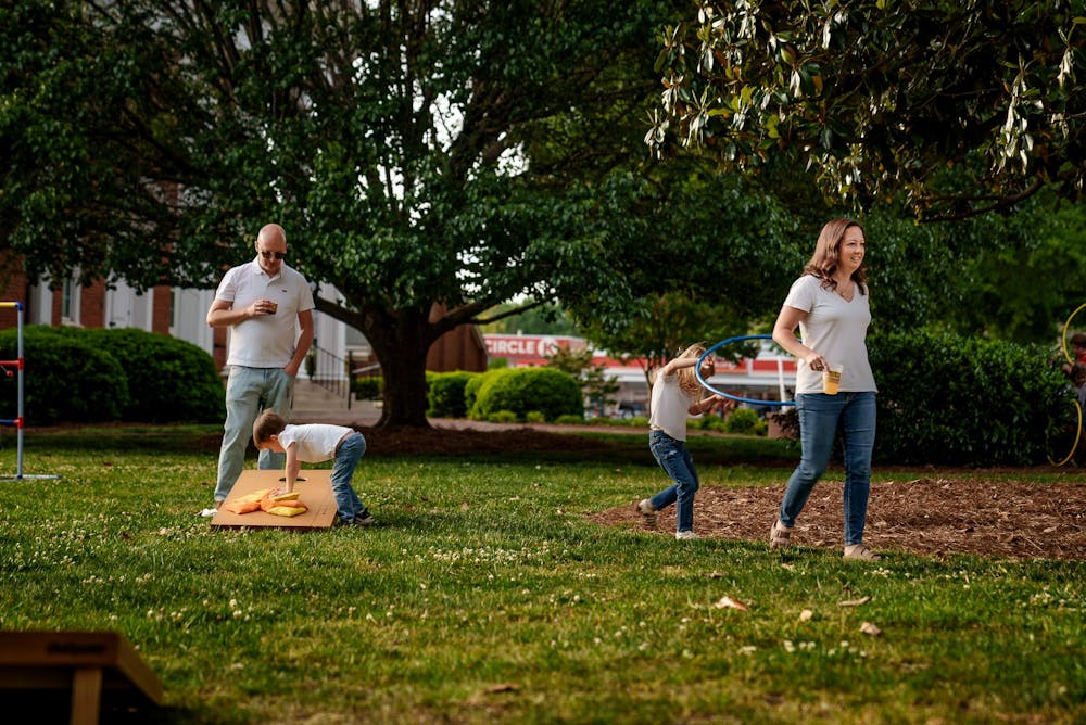 A family spends time together with games during Music next to the Elon Community Church on May 2 at Elon Town Square.