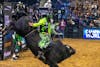 Missouri Thunder bull rider scurries to the corner after he fell off a bull on Sep. 12.