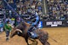 Bull Rider Sage Kimzey rides a bull at the PBR Carolina Cowboy Days event on Sep. 12.