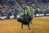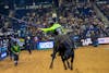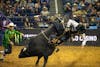 Bull rider for the Austin Gamblers, Jose Victor Leme rides a bull at the PBR Carolina Cowboy Days event on Sep. 12.