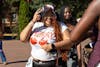Damani Grayson makes a peace sign during the Welcome B(l)ack Cookout Aug. 30 at Phi Beta Commons.