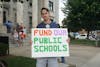 Demonstrator holds a sign reading 'Fund Our Public Schools' outside the Alamance County Historic Courthouse before the County Commissioners meeting on June 16, 2025