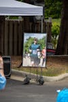 A photo of Josh running in the Pride In London 10K sits on display at the Jogging For Josh 5K finish line on May 3.