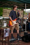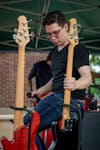 Bassist and vocalist of The Fandinos, Brandon Cole, switches instruments after finishing a song during Music at The Plaza on May 2 at Elon Town Square.