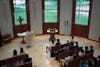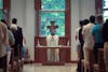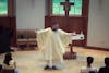 Father Peter Tremblay leading a memorial mass for Pope Francis on April 22 in the Numen Lumen Sacred Space.