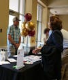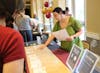 Elon students visit a table set up by Elon Dining at the Sustainability Master Plan 2025 launch party in McKinnon Hall on April 22. An activity is set up to rank which foods produce the highest emissions.