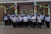 McEwen Dining Hall Staff pose for a photo in front of the McEwen Dining Hall for Mardi Gras on Feb. 17